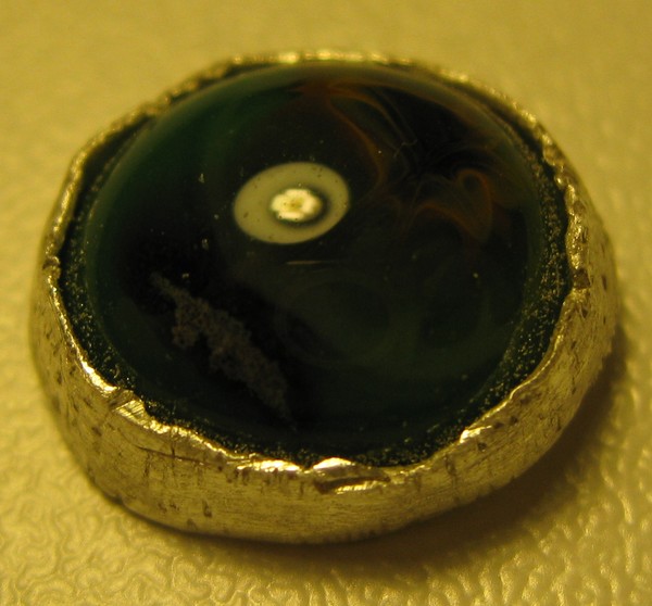 Made from ArtClay Silver. 99.9% Silver pendant around 1/2 in. With a fused glass piece made in the microwave.