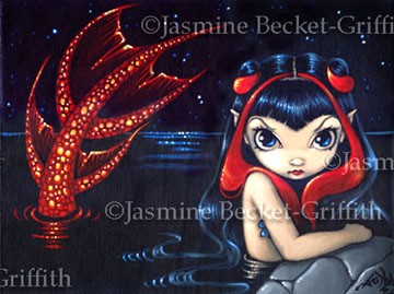 A slightly goth mermaid out at night with her red tail shining in the moonlight.... My own original acrylic painting. ©Jasmine Becket-Griffith - prints are available at http://www.strangeling.com and http://zazzle.com/strangeling*