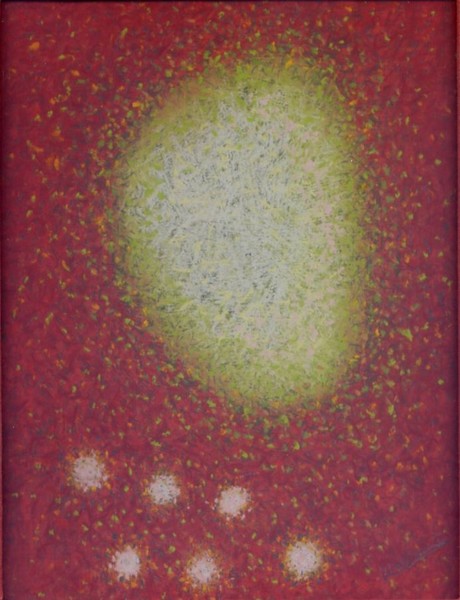 Pastel/Graphite pointilism abstract with 1 large oval element and 6 smaller round elements on hardboard.