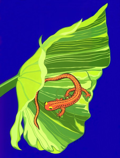 Looking for shelter, this little guy hasn't turned off his brightness yet for camouflage. The variegated leaf provides a perfect back drop for the iridescence of its shiny coat. "Let me hide with you," it says.