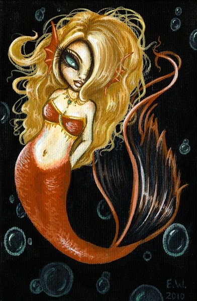 This is a miniature fantasy painting titled "Sea Vixen". The painting features a sexy mermaid long flowing hair and glistening scales. This piece was made with acrylic paints on stretched canvas measuring 4" x 6".