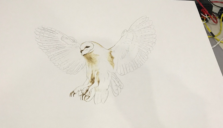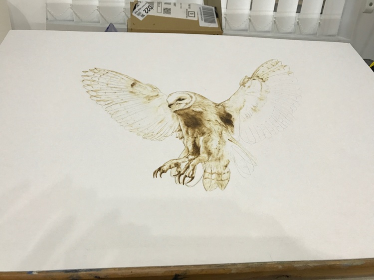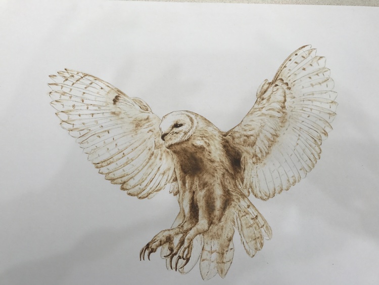 Pyrography burnt onto mounting board, 56 x 44 cm . Reference Photo found in a Sussex wildlife lottery advert, photographer unknown.