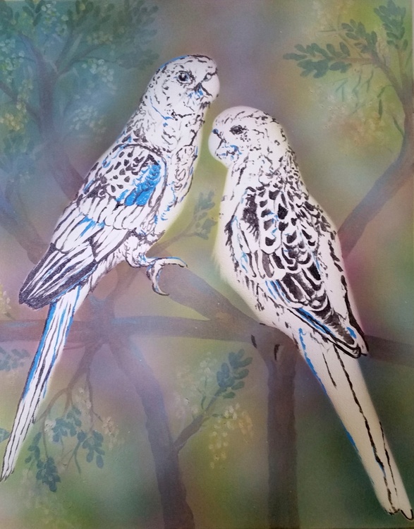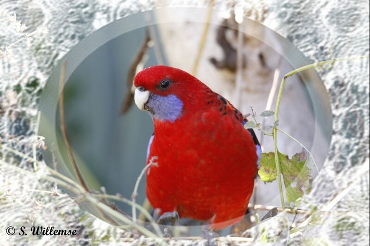 This artwork shows an adult Crimson Rosellas and a younger Crimson Rosellas. The younger crimson Rosella has green feathers for camouflage. These are beautiful Australian birds with stunning personalities and have a high chirping sound. They are often found in out nesting boxes on our veranda supplied just for them.