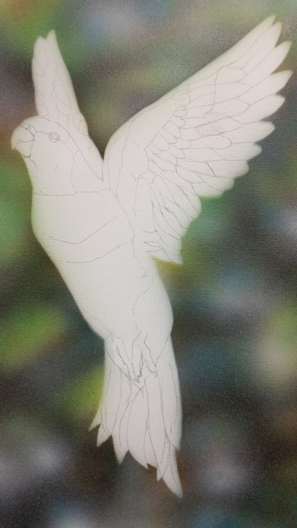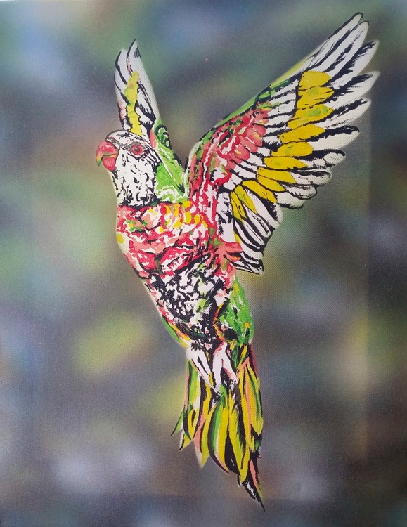 This artwork shows a Rainbow Lorikeet flying upwards and towards the light. Painted with CRPS it was painted as Art therapy to show there is Hope for anyone suffering in the world. The artist acknowledges Healing arts, mindfulness and wellness as well as the power of nature for positive psychology and outlook on life. 46cm x 36cm x 1.5cm.