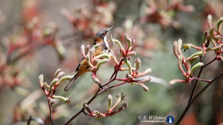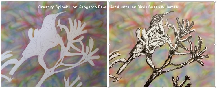 This artwork shows a Spinebill on Kangaroo Paw. Spinebills are small Australian birds that feed on native nectar plants like the kangaroo Paw so called because of it's resemblance to Kangaroo Paws.