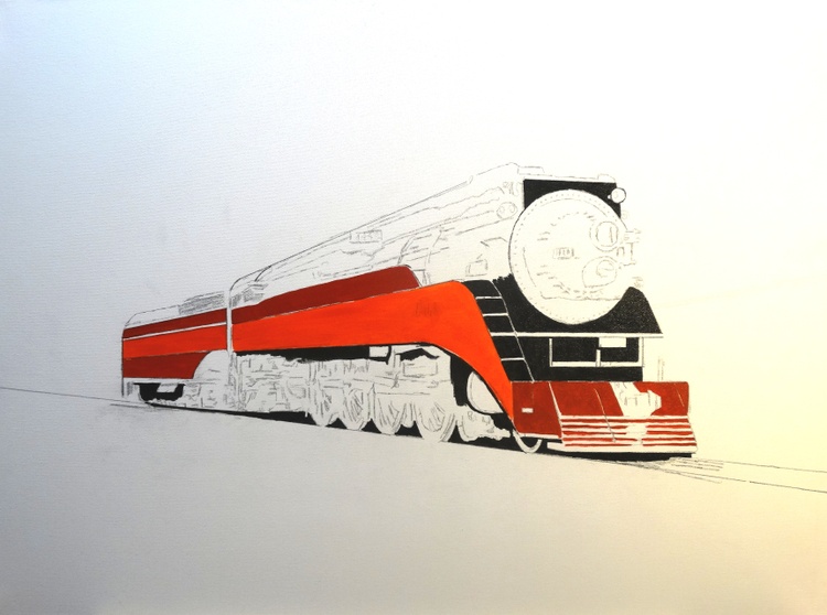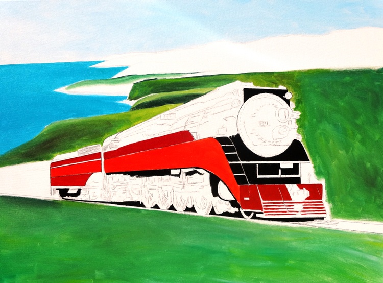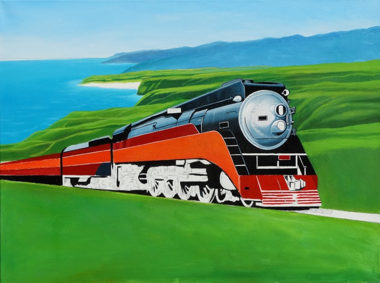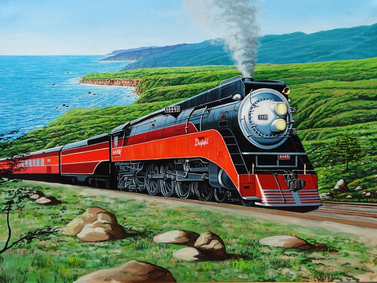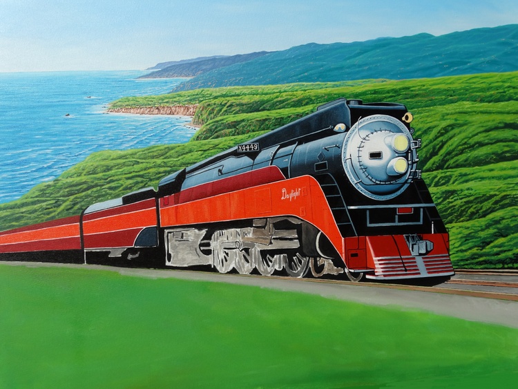 This painting of the Southern Pacific “Daylight Limited #4449” locomotive is considered one of the most beautiful passenger trains ever manufactured. It was built in Lima, Ohio in 1941 and officially retired in 1957. It traveled the California coastline between San Francisco and Los Angeles between the 1940’s – 1950’s. It is the only surviving example of Southern Pacific Railroad's GS-4 class of steam locomotives. There is one other GS-class locomotive surviving, but it is a GS-6. The locomotive is a streamlined 4-8-4 (Northern) type steam locomotive. GS is abbreviated from "Golden State", a nickname for California (where the locomotive was operated in regular service), or "General Service". It is located in Portland, Oregon.