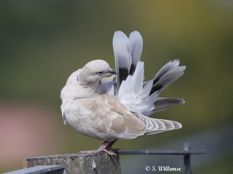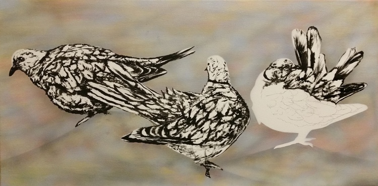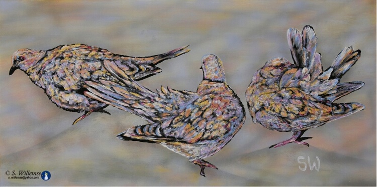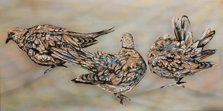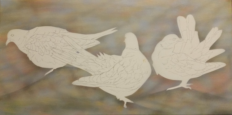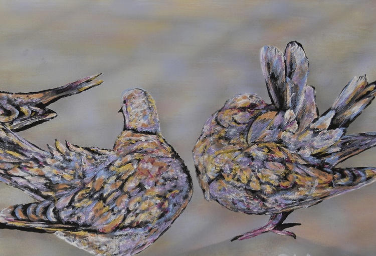 Doves was created to show these gentle birds after the last Dove disappeared from our roof. One flew away in a storm, one was killed by a neighbour cat and the other just left possibly to find other birds to be with again. We had three originally that lived there for over 3 years enjoying our bird bath and seed we provided for them. Doves like all birds need to waterproof their feathers using the gland at the top of their tails so they can stay in good condition and these three were no exception spending the hour preening making their feathers perfect while we photographed them with the light reflecting off their feathers. It is the soft beige, grey and purples I enjoyed experimenting with in this artwork.