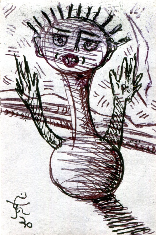 Ordinarily, the small details that collectively make up our everyday reality, shift and change slowly over time and we can't see it happening in real time. 2020 gave us, if not 20/20 vision, at least an avalanche of a new reality. Now many of us are even more fearful of our fellow men (women, children, maybe dogs) than ever before. And if you are intelligent, that fear is tiered. If you can't go anywhere, do you lose your mobility? This is a 6 by 4.5 inches gel pen drawing on medium bond acid-free paper. I also used color pencil. There's an action/reaction thing going on and Original Jones Art is throwing up his hands in northwest Austin, Texas.