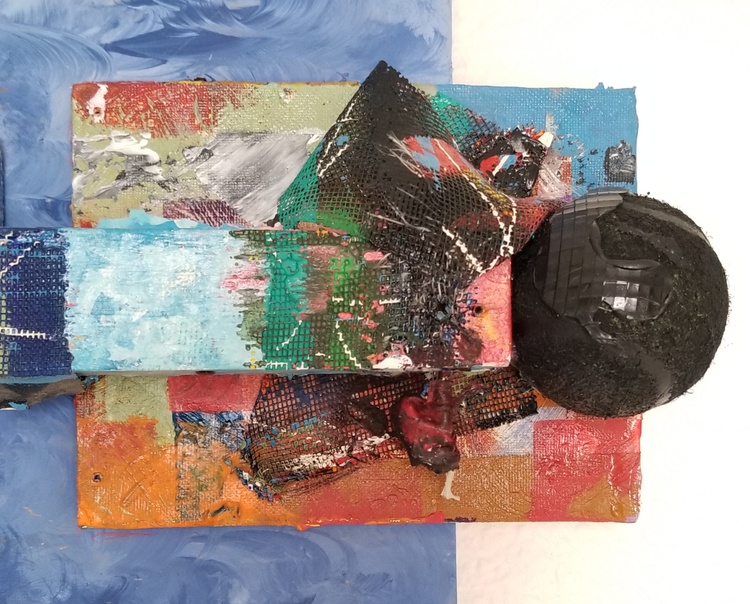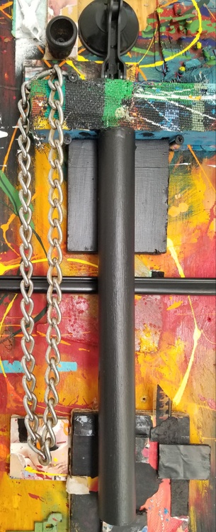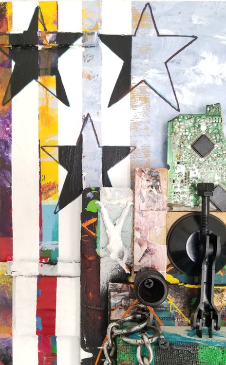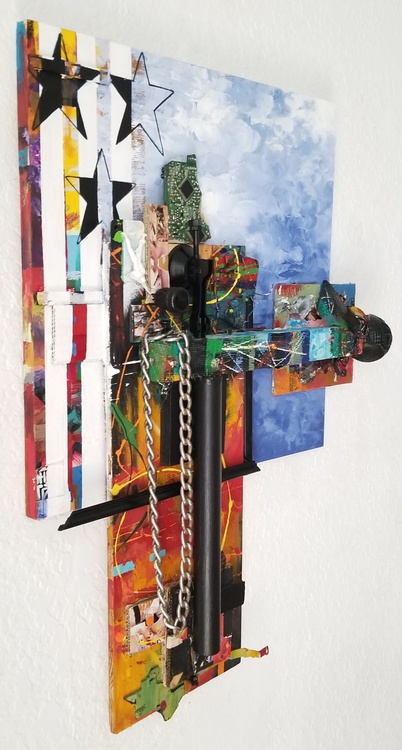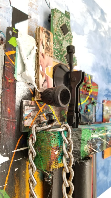 'A Better Tomorrow' mixed media: acrylic paint, chain, found objects on wood. 29" x 22" x 4" KNewArt '20 $3500.00