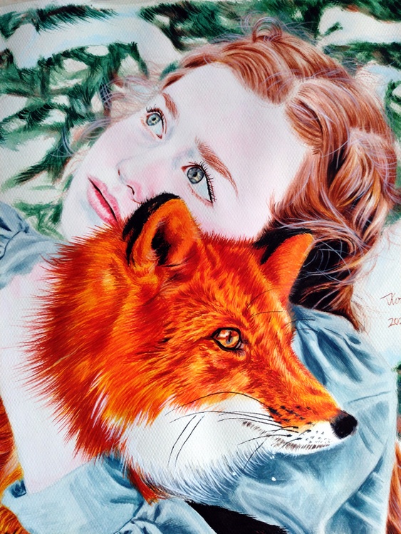 Attachment (38 x 53 cm, gouache on paper, 2020 finished) A girl, a fox, they had a good long hug in the snow. Love is a greeting with life.