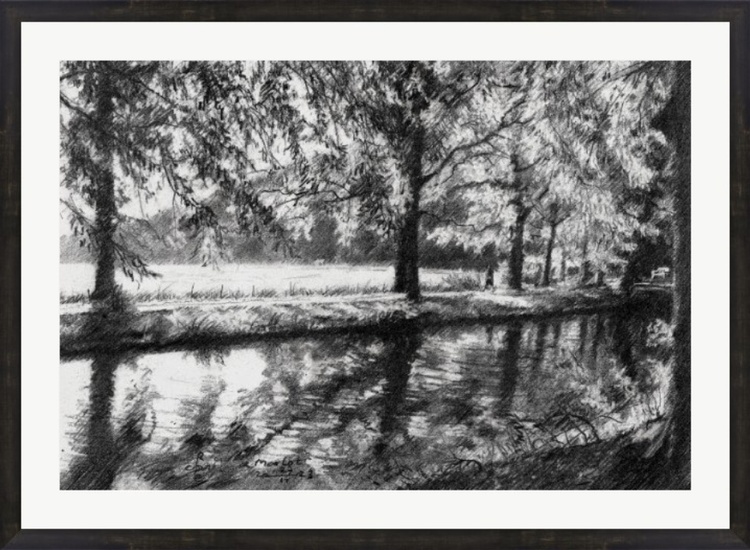 Still Freezing Cold This graphite pencil drawing ‘Marlot – 27-04-23’ follows my previous drawing of Park Arentsburgh. This how it goes, walking to and fro. Going from one spot and back again. The amazing thing is it’s still freaking cold, even at King’s Day. It was freezing in some areas in The Netherlands last night. Consequently I still haven’t sketched outdoors yet this year. Amazing, isn’t it? In Spain temperatures hit a scorching 39 degrees Celsius this week. Here we still face a chilling northern wind. When I look at drawings from the past I see I sketched in nature as early as March. However, weather forecasts are in favor of those who want to dwell outside next coming weeks. Hopefully so! Along the Path This having said, still drawing from my stock of reference pictures. This time Marlot was on the menu once more. My last one depicted the old mansion over there. I remembered I had taken some pictures along the canal that ends in some kind of pond in front of it. This drawing is situated a couple of 100 meters to the left, towards The Hague. During corona times I often dwelled there. That was a welcome deviation from my daily drawing and painting activities, not being able to teach in groups. I was caught by the great lighting on a sunny day in May. The tree line in the back actually is the same as in an earlier drawing of 10 years ago. Overcoming Difficulties I set out on this drawing like I am used to. Simply hatch the paper up with diagonal lines and erase back the lightest parts. See what’s next from there. Soon I figured out I had to change my plans and come out with a better scheme. The thing was that the tree line in the back, being Marlot Forest, wasn’t showing too much contrast. The leaves in the front just weren’t contrasting the trees in the back that much. Where it all boils down to is that I had to crosshatch suggestions of leaves in the trees upfront. Hence the typical hatching disappeared quite a bit. Sometimes that’s what it needs. Working in monochrone hues sometimes it’s difficult to create enough contrasts in different sections. I hope it’ll be enough to distinguish between all intended objects. Graphite pencil drawing (Sakura 0.5 mm, 4B) on Winsor & Newton Bristol board paper (21 x 14.8 x 0.1 cm – A5 format) Artist: Corné Akkers