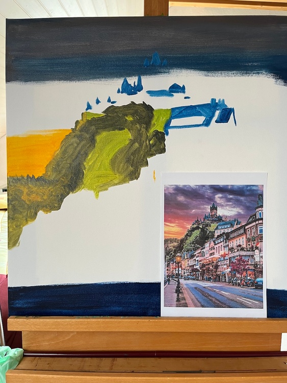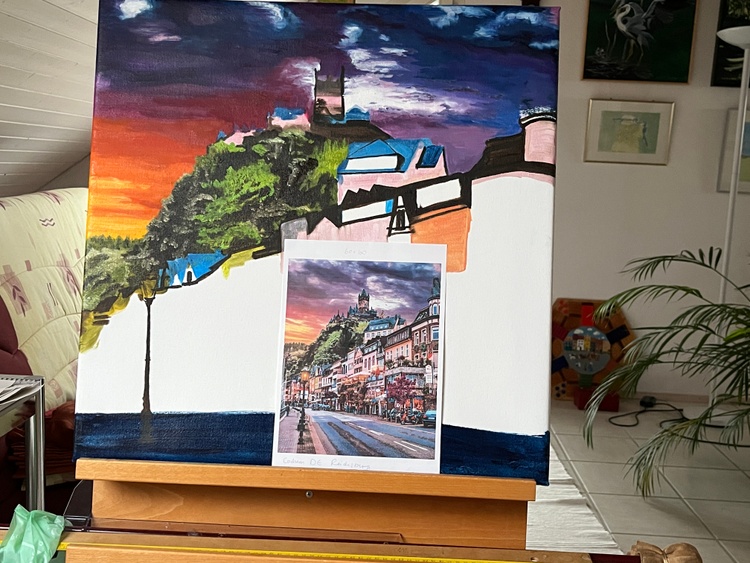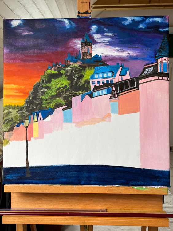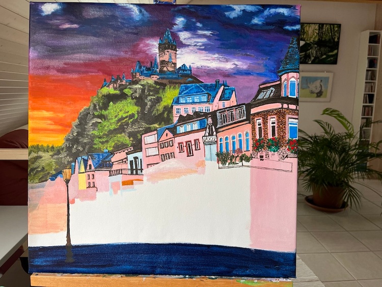 This colourful oil painting shows the picturesque town of Cochem in Germany. In the centre of the picture, the Reichsburg castle sits majestically on a green hill, giving the scene a fairytale atmosphere. The buildings display a variety of architectural styles, from traditional half-timbered houses to more elegant townhouses. The street life is brought to life by small details: Shops with awnings, street signs, parked cars and scooters give the impression of a busy but cosy small town. The dramatic sky, which takes up the upper third of the picture, is particularly impressive. It shows a spectacular sunset with bright orange and red tones that fade into deep blue and violet. This intense colouring lends the painting additional emotional depth and dynamism.
