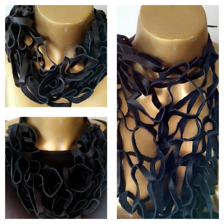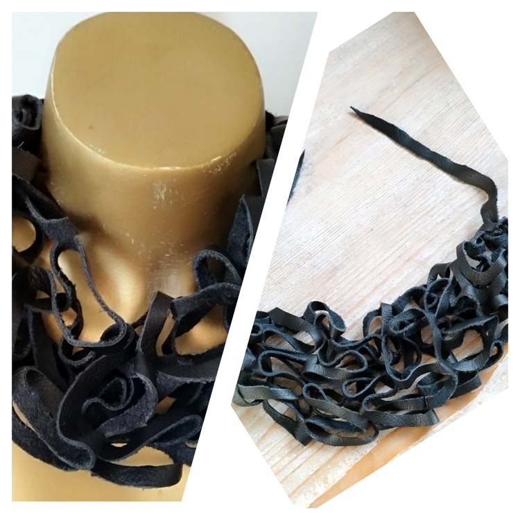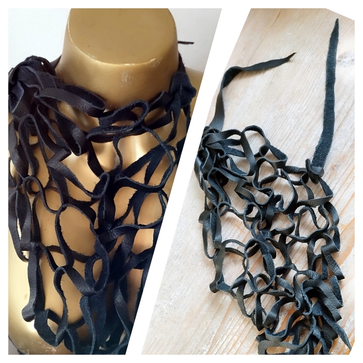 multifunctional black (recycled) leather scarf necklace closure with leather cords - so you can wear it in different ways
