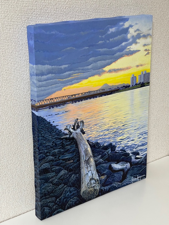 An acrylics painting on canvas. Driftwood on rocks, at sunset, near Tokyo Disney Resort, with Mt. Fuji in the background.