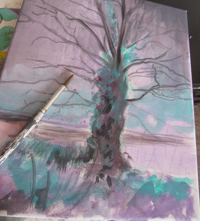 An acrylic painting of a chilly, still, and magical morning, with a full moon still shining in the sky and frost coating everything in tiny sparkles