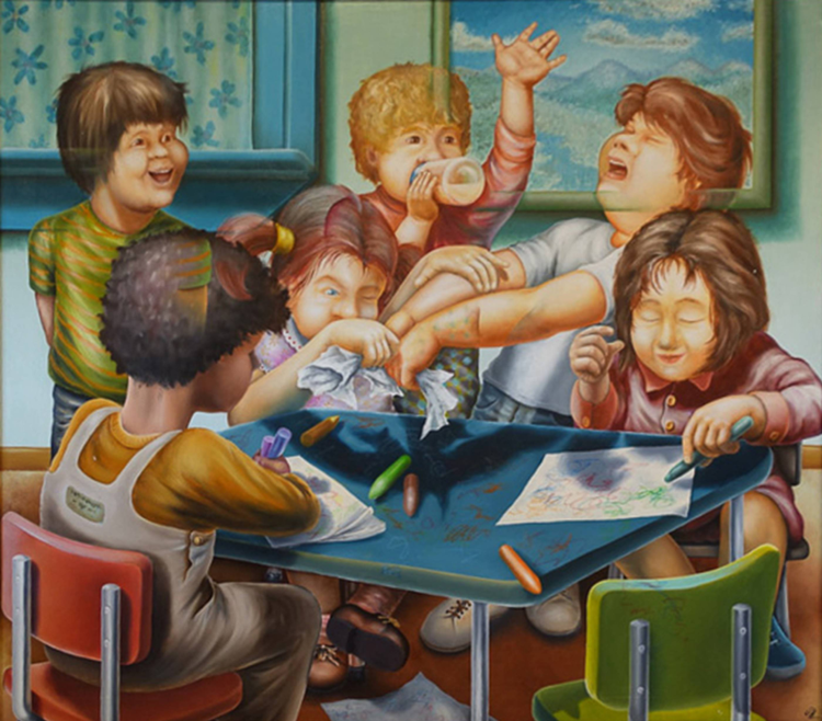 107cm x 92cm - I have painted these children merging into each other to show that people are all the same. Yet each one of us is different Childhood rivalry is often seen as harmless. Children competing over toys. Arguing over games. Or forming small groups against one another. Yet, what begins as simple disagreements in childhood can grow into something far more destructive in adulthood. The same instincts that drive children to fight amongst themselves evolve into deeper divisions. Shaping ideologies, nations, and warfare. What started off as playful competition turns into man against man. The echoes of childhood conflicts can be seen in the way adults engage with one another. Just as children draw imaginary lines between 'us' and 'them', adults do the same on a grander scale. Waging wars over power, resources, and beliefs. Meanwhile, just as some children remain indifferent to their peers’ disputes, many adults go about their lives, blissfully unaware of the forces shaping their world. Indifference, whether in childhood or adulthood, allows rivalries to escalate unchecked. Proving that human nature, from childhood to adulthood, remains locked in the same endless cycle of conflict and division.