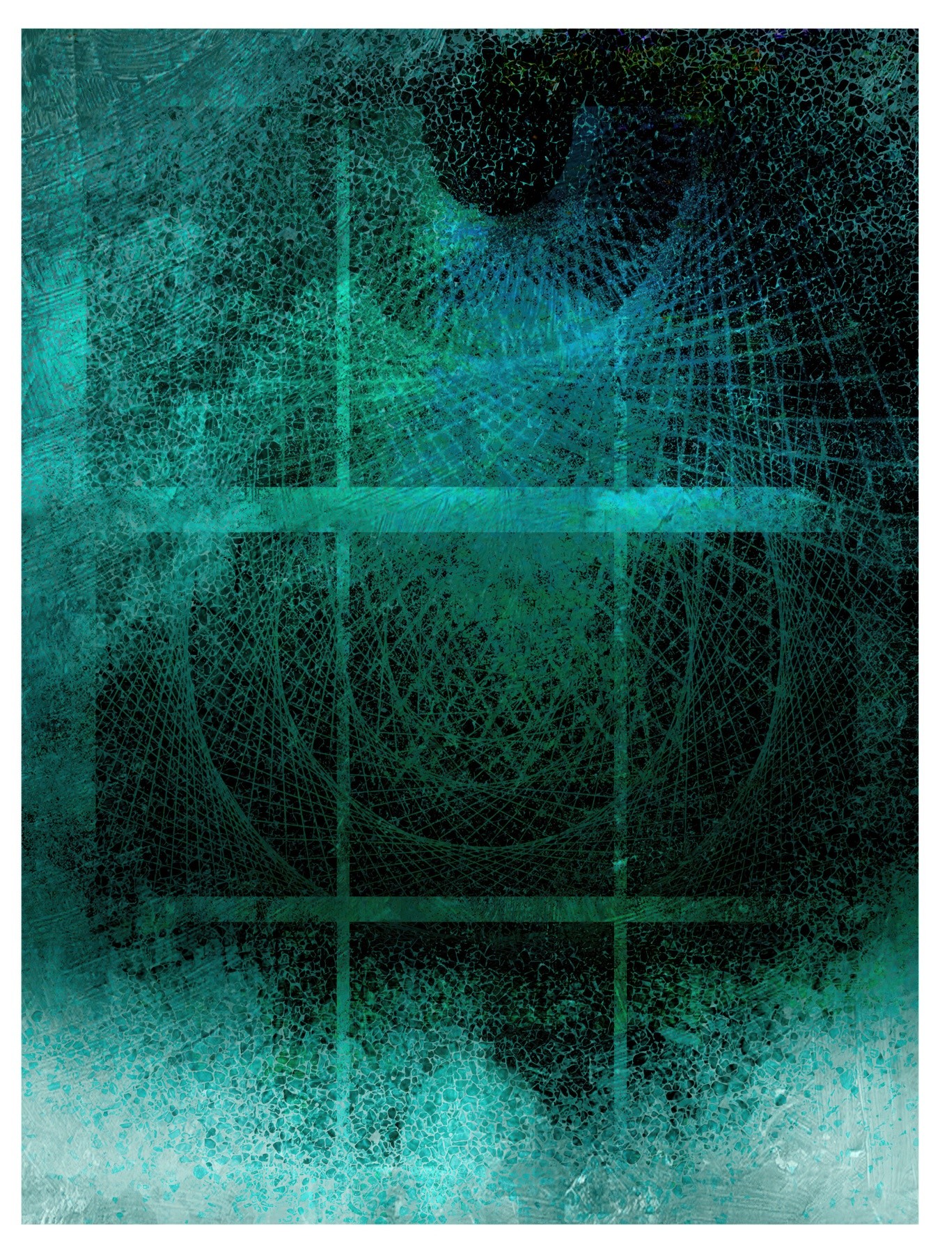 A mesmerizing web of teal and shadow spirals inward, forming a hypnotic vortex where geometry and texture collide in quiet tension. The layered grids and fractured patterns evoke an abstract, ethereal space—like a portal suspended between structure and chaos.