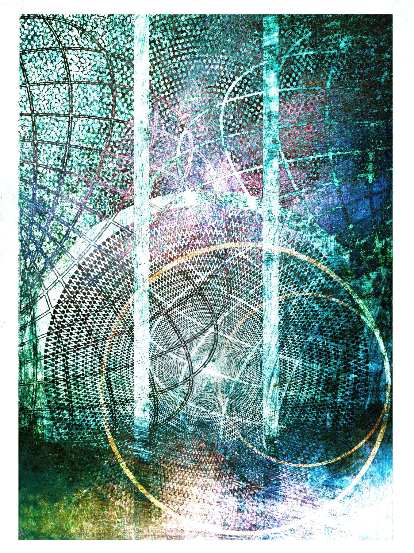A luminous, layered abstract with turquoise, violet, and deep green textures that feel charged with hidden energy. Its overlapping circles and vertical light bands create a ritual, otherworldly mood, like a portal revealing something ancient and unseen.