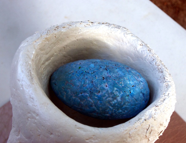 We are all dreamers on both a conscious and unconscious level. I think we grow up with a large one still with us though we sublimate it, or have that done for us. This piece is really a hybrid paper product though I don't think it is very obviously so. It stands roughly a foot tall. In its 'nest' resides a blue egg that symbolizes the one big dream of our lives. I made it ridged and grooved to suggest the organ in which it lives (or dies.) Original Jones Art? I have to believe it is though Austin, Texas is still undecided. ;) Addendum: This piece was chosen to be in the AVAA's Membership Show, September 2018.