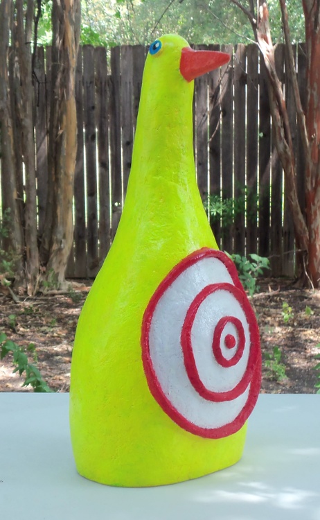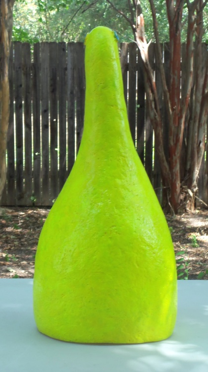 This is another piece using my hybrid formula that might be considered part air dried clay and part paper mache. It measures 18.75 inches tall, 8 inches at its widest and approximately 6 inches deep. I used acrylics to paint it. It is a simplified version of a paper and then painting idea. I think kids might like this---and it's tough as the proverbial boot. Original Jones Art emanating from Austin, Texas.