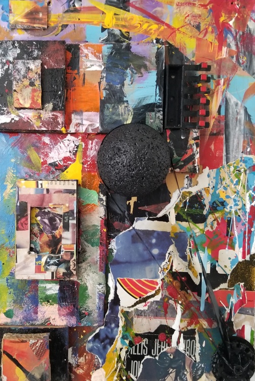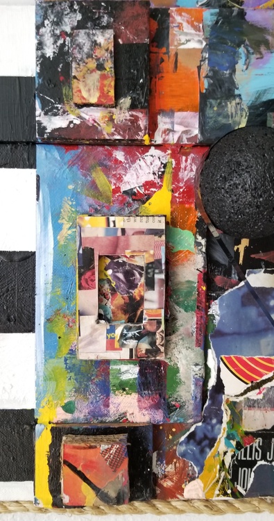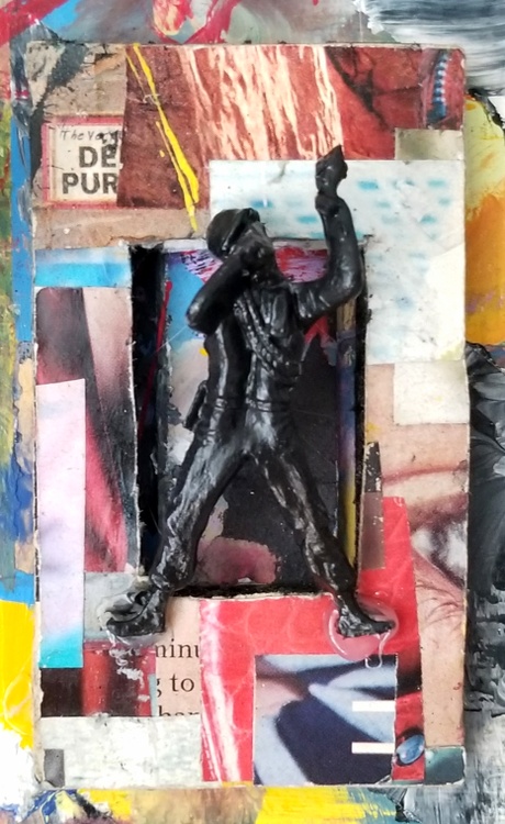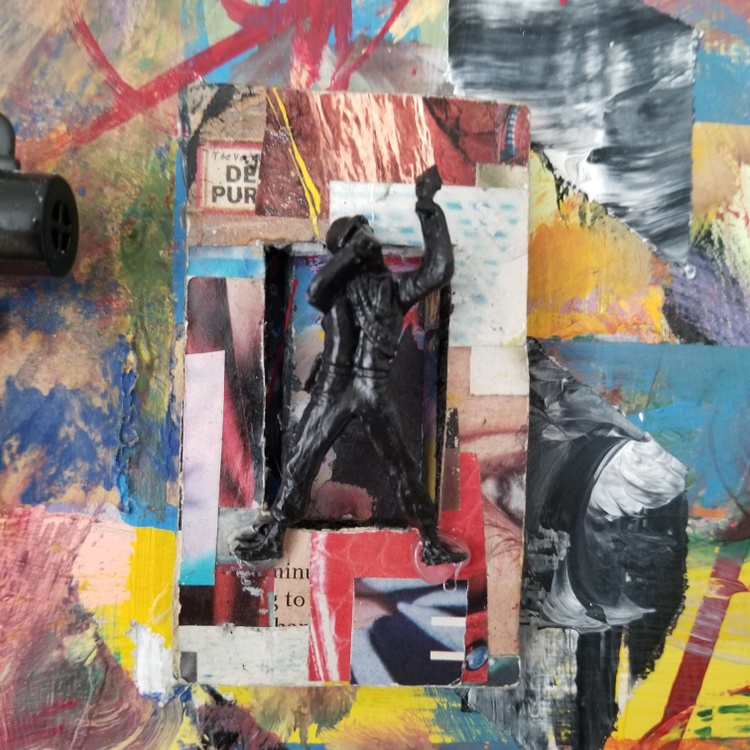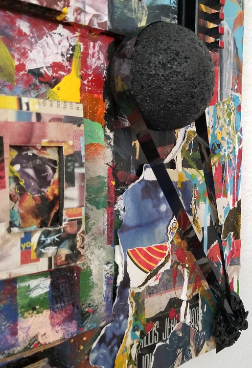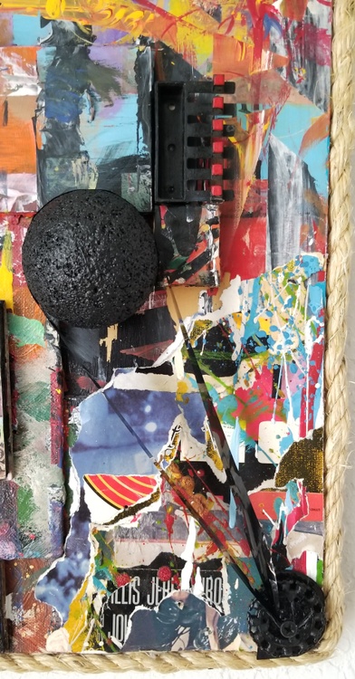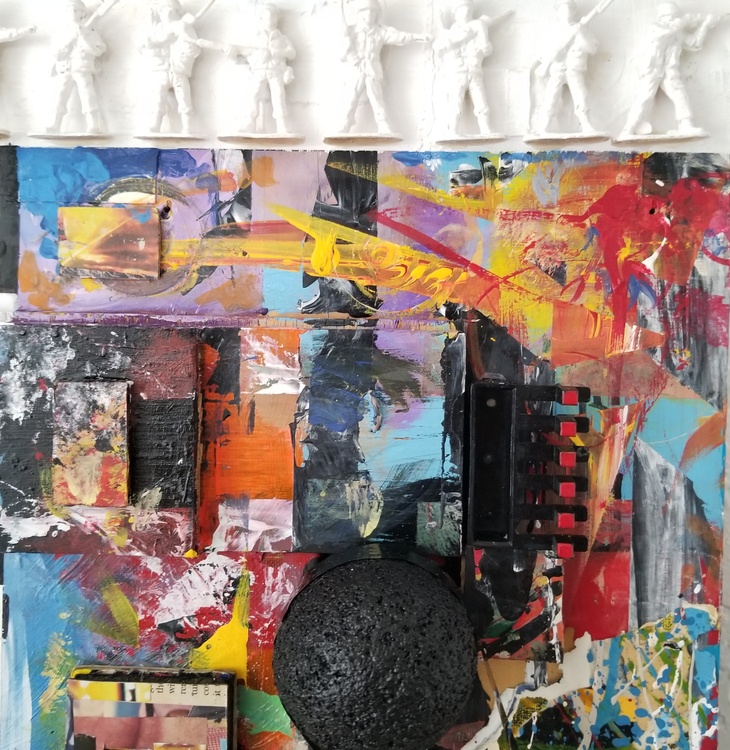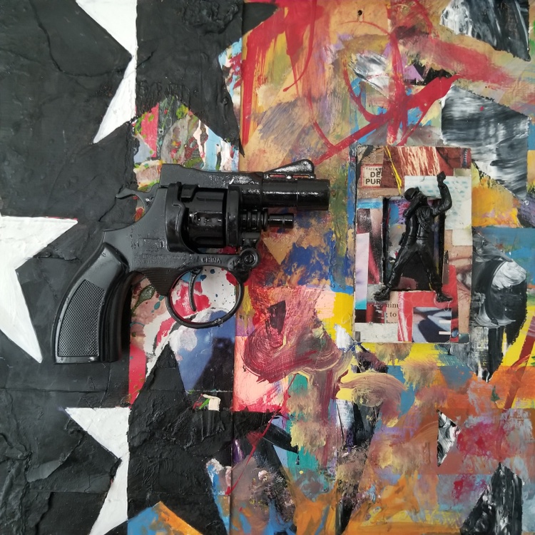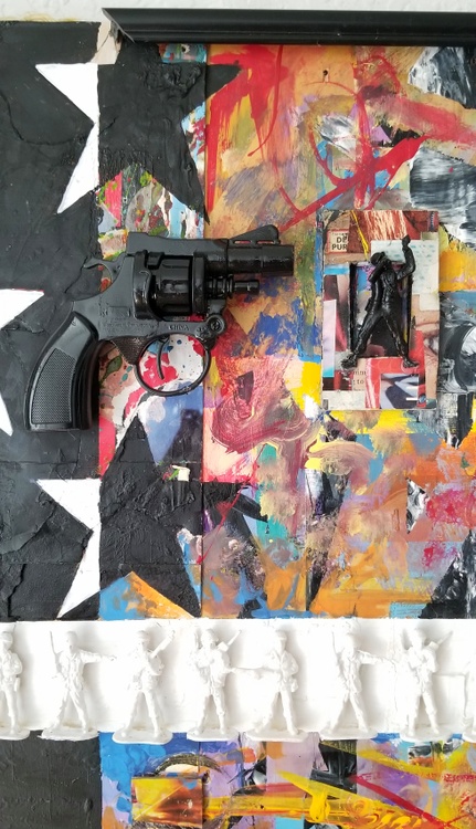 'Home is Where The Hatred Is' mixed media: acrylic paint, paper collage, rope, video tape, toy gun on wood. 28" x 27" x 4" KNewArt '20 $3500.00