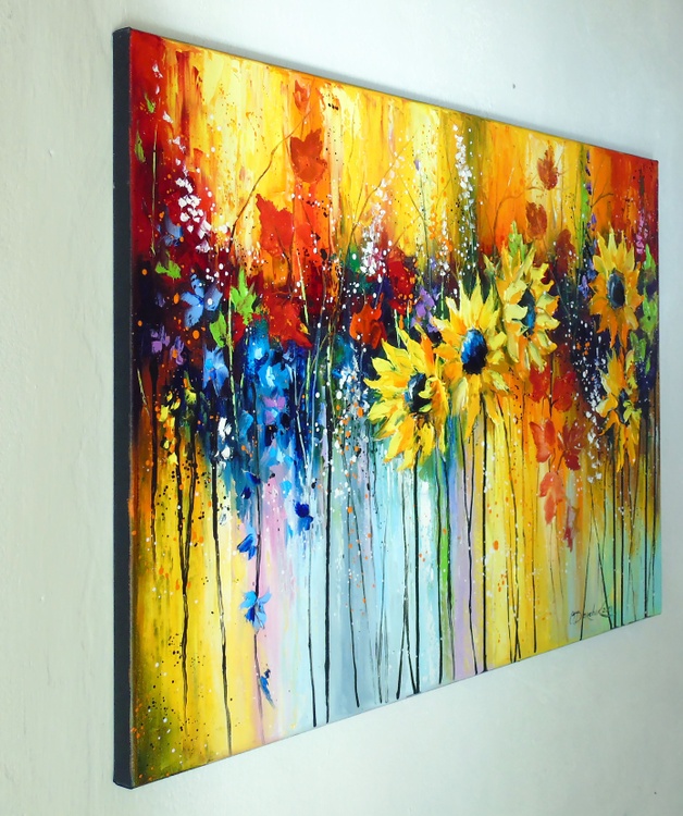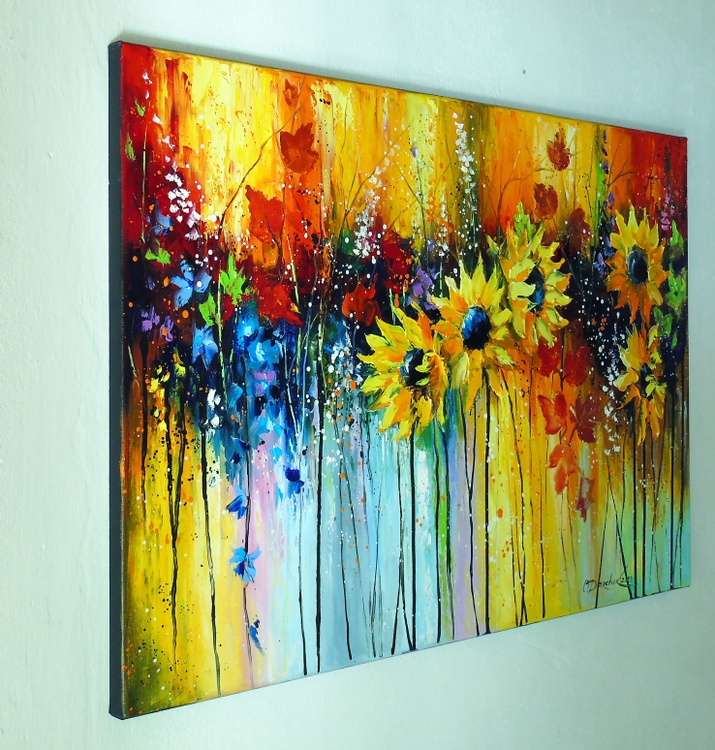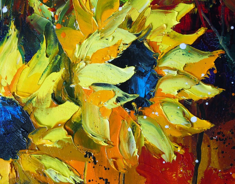 Melody of Autumn, the painting is painted in high quality oil on canvas, 100% handmade. For family, as a gift and just for a good mood. In this vibrant oil painting, I poured my soul into capturing the essence of transformation. The sunflowers stand tall, a burst of life against the warm autumn palette, a dance of colors that sing of change and resilience. Every stroke is a melody; a composition of light and shadow that speaks to the heart. Let this piece enliven your space, bringing a symphony of warmth and the enduring spirit of nature's beauty.