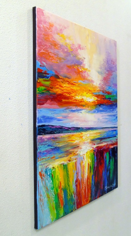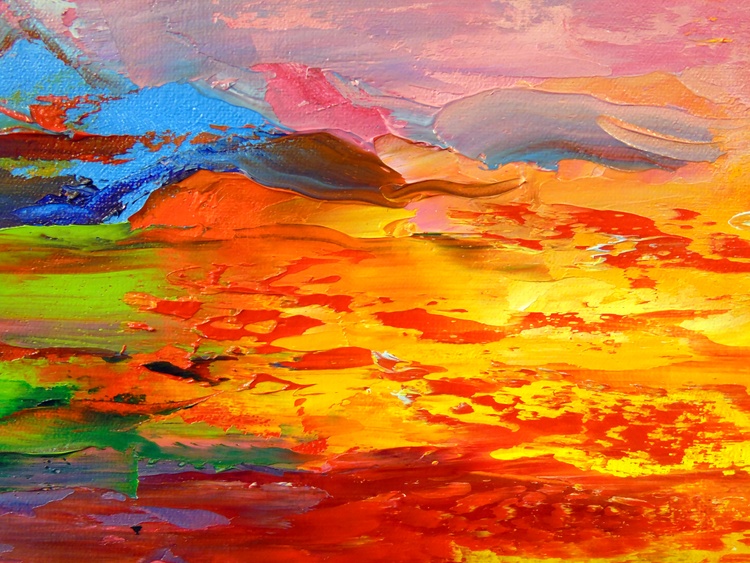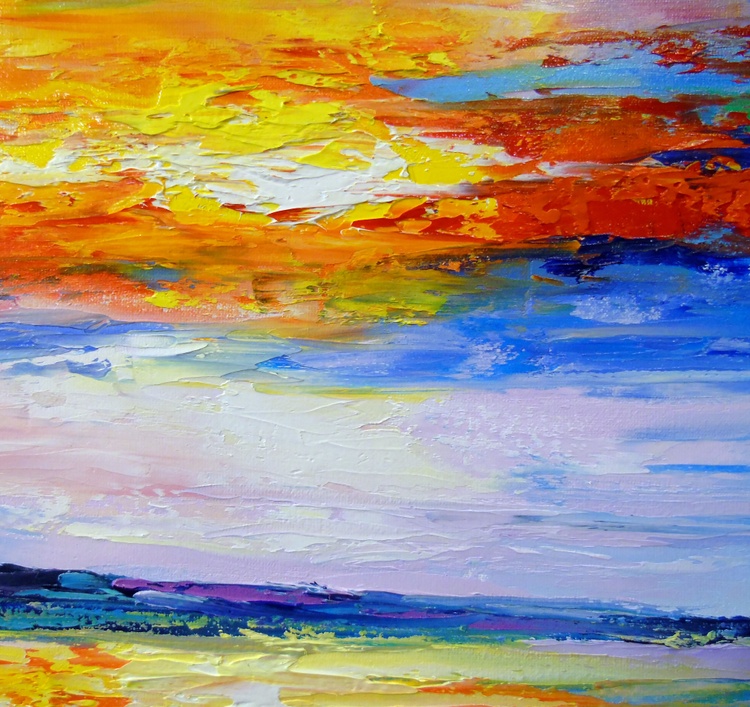 On the edge of a bright abyss, the picture is painted in oil on canvas with painted edges, 100% handmade with a palette knife and highly professional paints, for a gift or for the family. Only positive emotions will be given by my work. Ready to hang. In this vivid tapestry of oils, I channeled the fiery passion of sunsets against the tranquil blues of the sea, capturing the dance between light and darkness. My brushstrokes hum with the energy of transformation, a reminder of nature's fleeting yet eternal beauty. This piece is a symphony of colors where the horizon blurs, inviting the onlooker to reflect on life's vibrant precipices. Its presence in your home will infuse your space with an invigorating glow and stir the depths of your imagination.