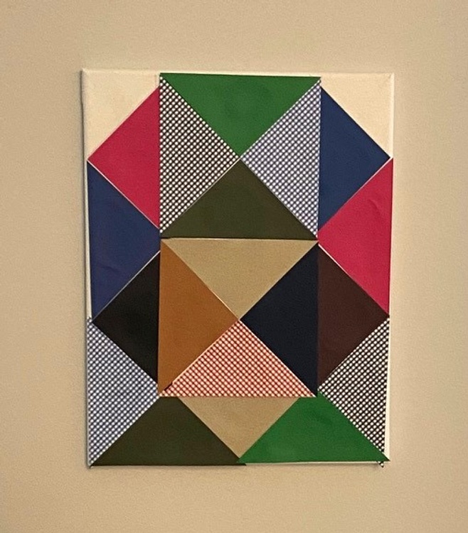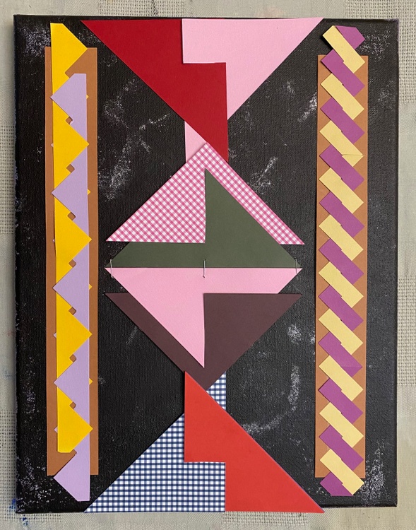 14" x 11" canvas with collage. A sun figure next to a flying figure. The project image is a different collage.