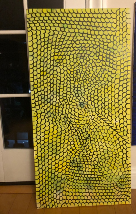 Trying something new. I wanted to blend a Kusama net painting with a Pollock drip painting as an experiment. The Dripping was a little messy so I reinforced the shapes I liked with oil pen.