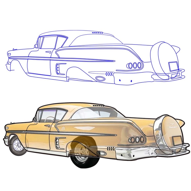 A 1958 Chevy Impala. The Bel Air Impala was only built in sport coupe or convertible models and was a departure from typical Chevys & had a longer rear deck (called a continental kit) setting low on an X-type frame. Starting at $2586 - consumer choices were between a 235-cubic-inch Blue Flame I6 and a 283-cubic-inch Turbo-Fire V8 or a 348-cubic-inch Turbo-Thrust V8.