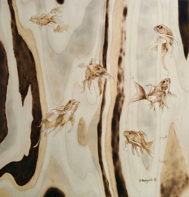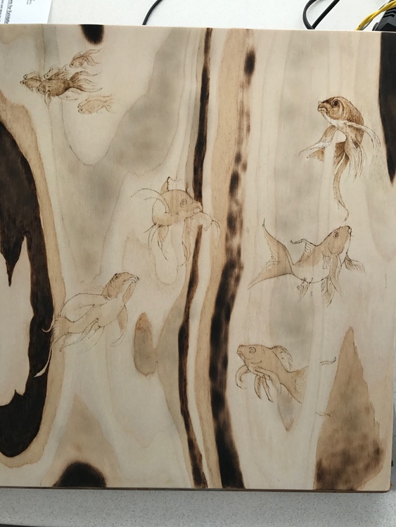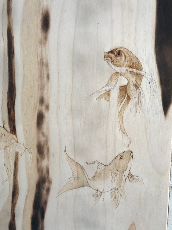 Wood Burning on Popular, highlights with white water colour pencil. size approx 16" x 17'