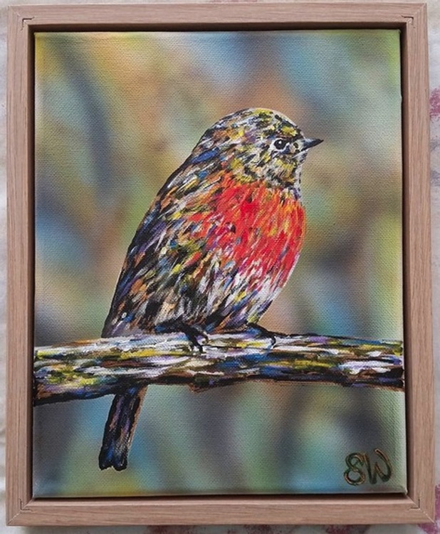 This artwork shows a single Red Robin on a branch. It was created using airbrush and acrylics on stretched canvas using our own photography as a reference. 25cm x 20cm x 1.5cm.