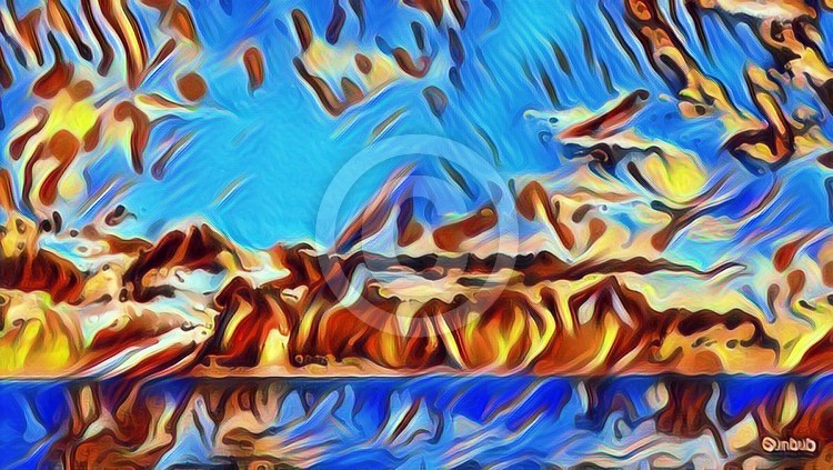 Lovely sky blue with browns and yellows. There is a dragon cloud and a laughing duck happy inside this art. It is only a vision away.