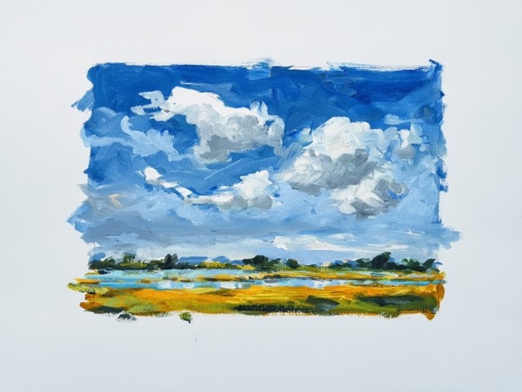 I've painted a serie artworks on paper named 'Land- and seascapes Zeeland. As a plein air painter I like to work outdoors in the open air. Everything is different: the colors, the shadows and the light changes every minute. To paint a right atmosphere, plein air painting is a must. That is why you see me daily with drawing and painting materials on a dike, in a polder or on the beach. A colourful nature landscape on Beveland in a sketchy style with acrylic on quality acrylicpaper 400 gr. (paper 65x50 cm, painting 40x30 cm).