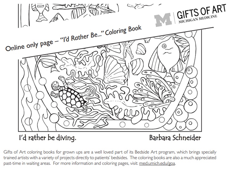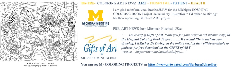 The Illustration/ Line Art for Coloring "I´d Rather be DIVING" is selected by Michigan Hospital/ Gifts of Art program at Michigan Medicine for the upcoming Coloring Book Project 2018: ".......On behalf of Gifts of Art, thank you for your original art submission(s) to the Hospital Coloring Book Project. .....We would like to include your drawing, I'd Rather Be Diving, in the online version will be available to patients for free download on the GIFTS of ART https://bit.ly/3OPvNDo ..", Medium/Technique: Ink hand made illustration, PSE 12, Inkscape (Vector)