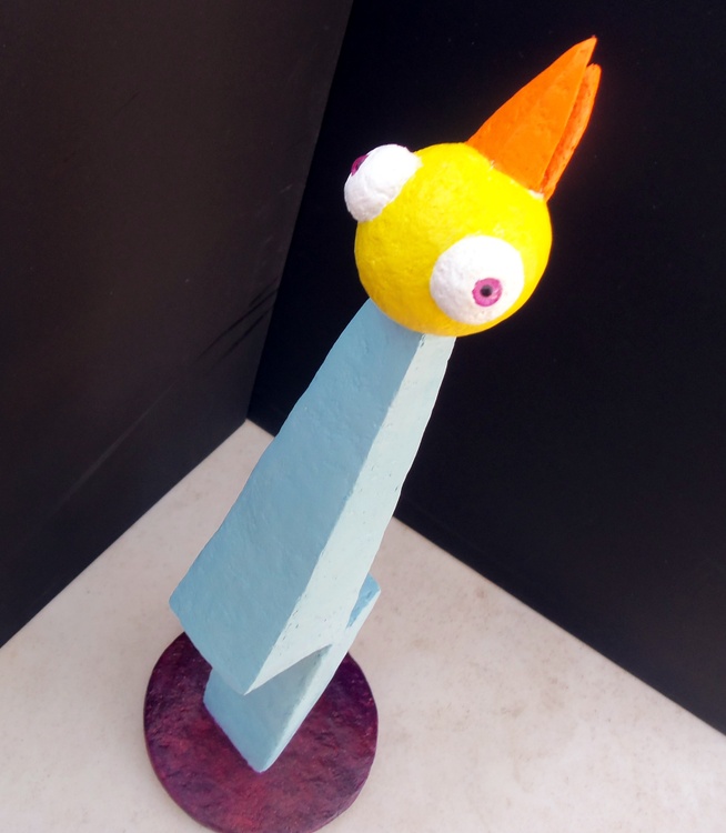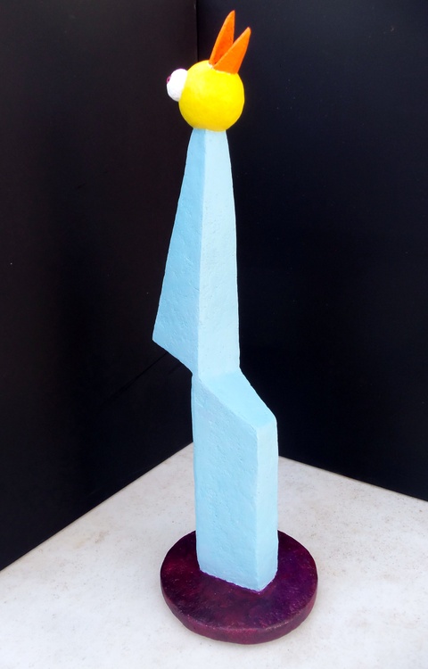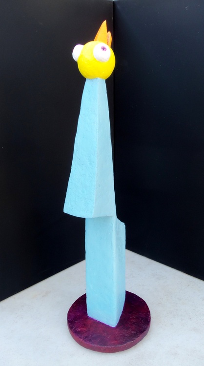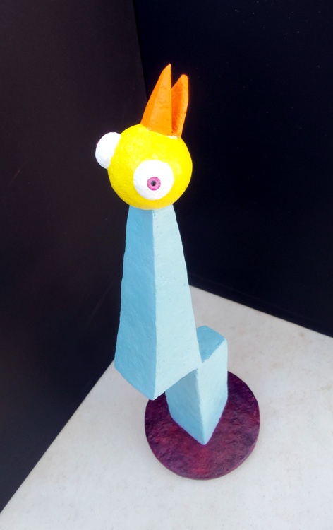 Based on a drawing that actually had multiple bird heads, I decided in process to simplify it to the one you see. I may have gotten lazy or I may have thought having three would have cluttered the piece. You decide. It is made using my custom compound and small doll's eyes purchased from the trusty internet. It stands roughly 20.5 inches tall and the base is 6 inches in diameter and is painted with acrylics.. This is the tallest pieces I've made to date. Please tell me it is Original Jones Art originating in the burgeoning metropolis I love so much, Austin, Texas.