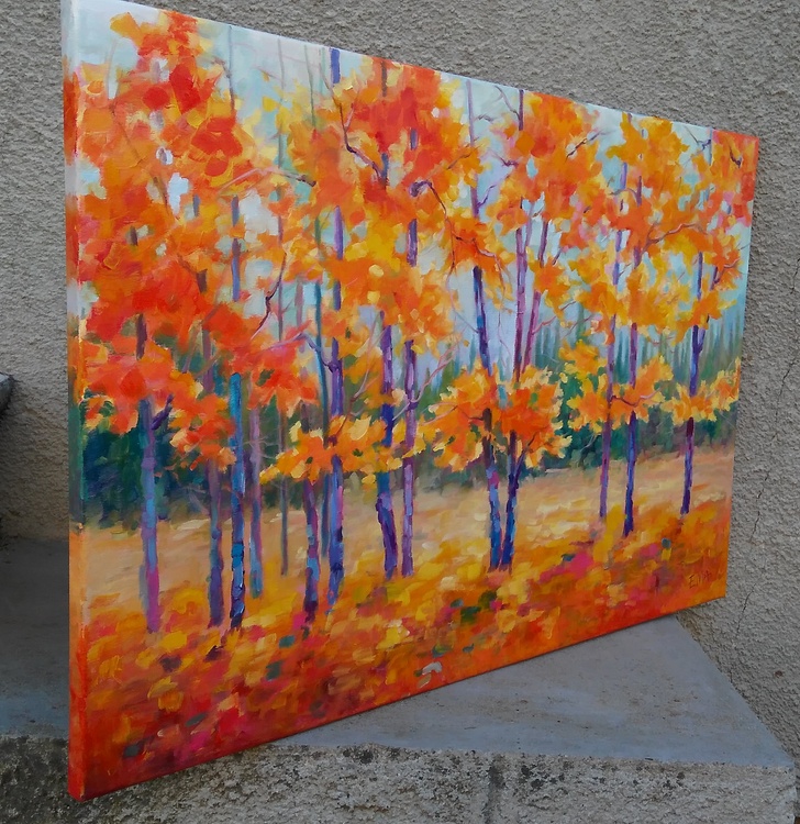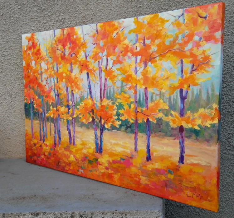I am practically in love with every tree. They are so beautiful in my eyes. So beautiful in their various stages of metamorphosis. So beautiful in their dramatically changing conditions and moods. So beautiful that they became my favorite subject to paint. I love the energy that I feel around them, the comfort that they bring in my soul, the strong connection with the earth that they teach me. I love the bunch of colors they radiate when bathed in light and how this palette changes during different seasons. Especially when Madame Autumn makes the mise-en-scene, trees become the greatest divas ever seen. This original oil painting is done on stretched cotton canvas 2cm deep. Sides of the painting are painted so it could be hang as it is without a frame if preferred. The painting will be sent safely packed within 4 working days after the purchase. A certificate of authenticity will be enclosed. *** please bear in mind that colours may slightly vary between the actual original painting and the way it looks on your screen due to different monitors settings***