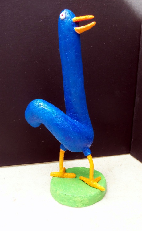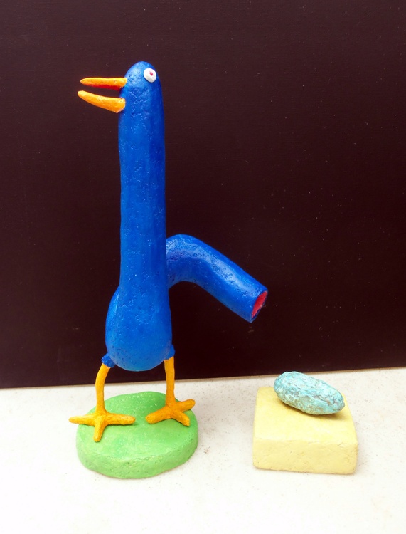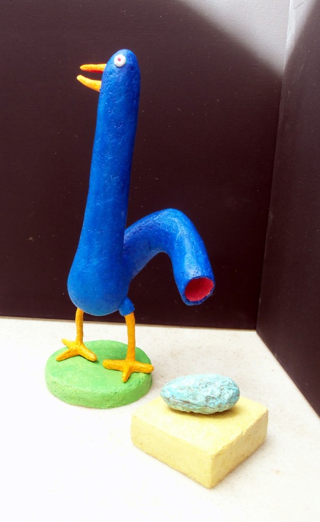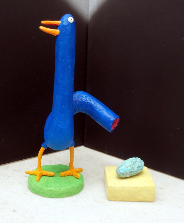 The original sketch more closely resembled a chicken with its comb but as I worked on the piece I thought it looked more like a grackle---and a male one at that. So I thought what would represent a reluctant incubator better than a male bird. It stands roughly 10.75 inches tall and its base is 3.5 inches wide. I made a little stand befitting the hard won egg which resides on its right. This is more of that dubious Original Jones Art as it manifests itself in Austin, Texas