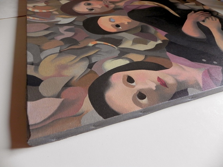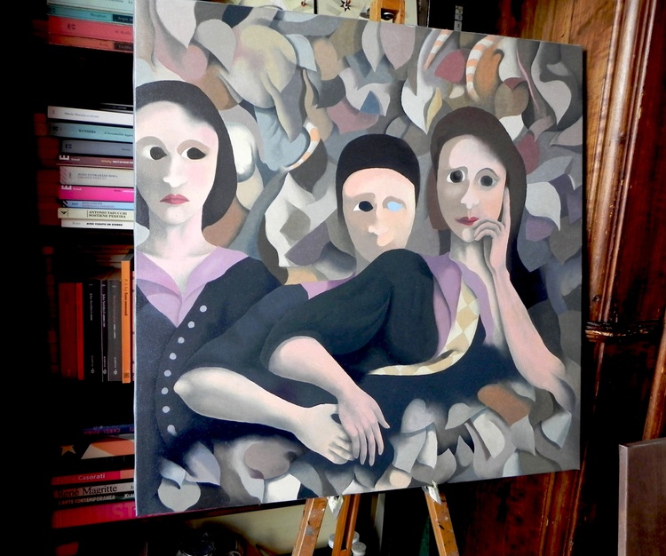 Oil on canvas, 1992, 70 x 70 cm. Three women, maybe three sisters, emerge from the memories of the past. They are half submerged in a layer of dry leaves, evoking the elapsed time, but maybe even a tomb. In case of sale shipping is worldwide free.