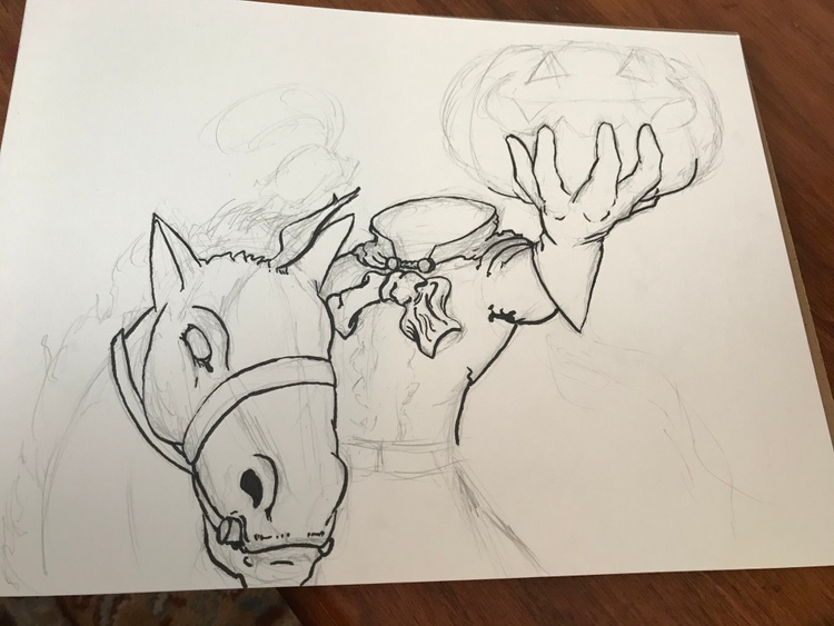 Ink and alcohol marker illustration on a watercolor background of the legendary Headless Horseman of Sleepy Hollow.