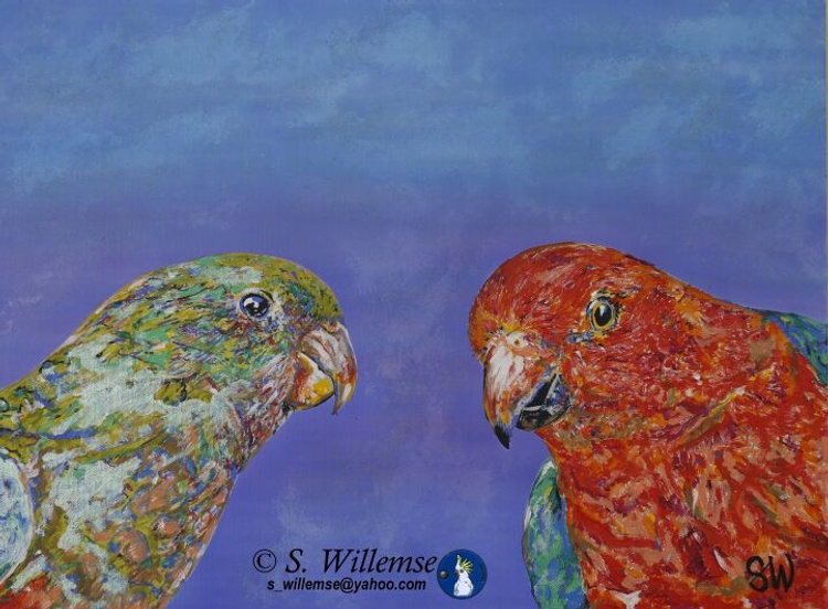 King Parrots was painted after meeting these delightful birds up close, the males are a bright red and the ladies are more camouflaged with green feathers but they are shy gentle birds that take their time to get to know you. King Parrots has been published in an overseas International WECONTEMPORARY MUSA hardcover collectors catalog in Russian, Italian and English. Special Thanks go to Alba Pinotti for inviting me to take part this lovely opportunity. You can take a walk with some wild King Parrots here https://www.youtube.com/watch?v=CWyUb5_c82Q