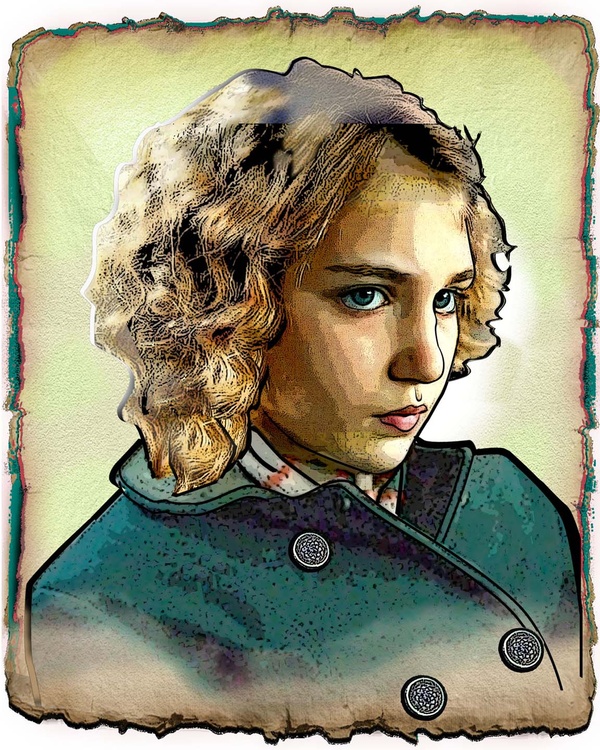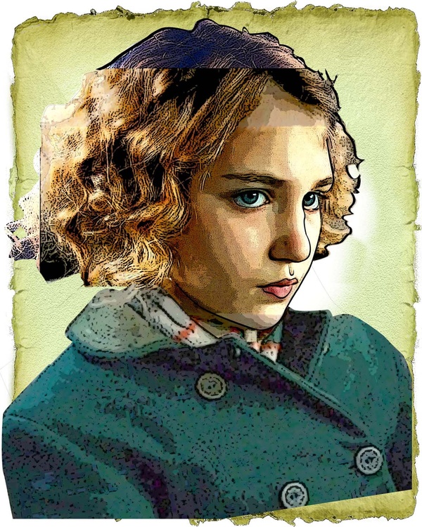 This image idea came from an internet ad for a movie (The Book Thief). The model is a young Canadian actress playing a young girl in WW2 Germany. Her situation & story make for a very good Video, but it was her expression that inspired an illustration.