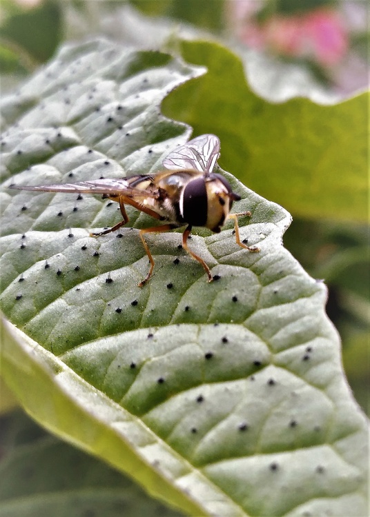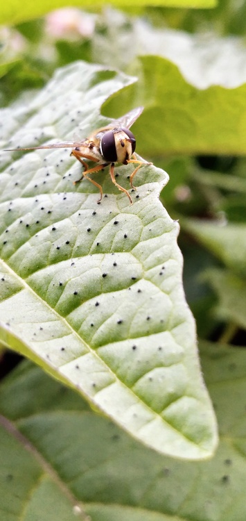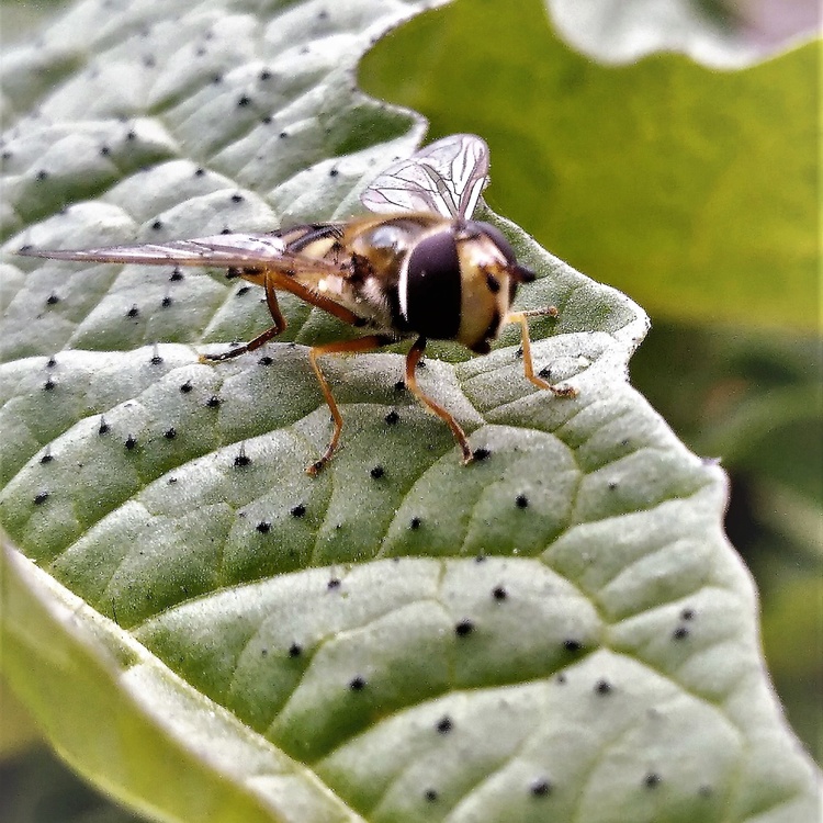 SYRPHE ON A NICANDRA LEAF .. THEY LOVE MY PLANTS .. ... I LOVE TO TAKE THIER PICTURE .. WE ARE QUITS .. THANKS FOR YOUR COMMENTS .. WISHING YOU ALL A VERY NICE DAY ..