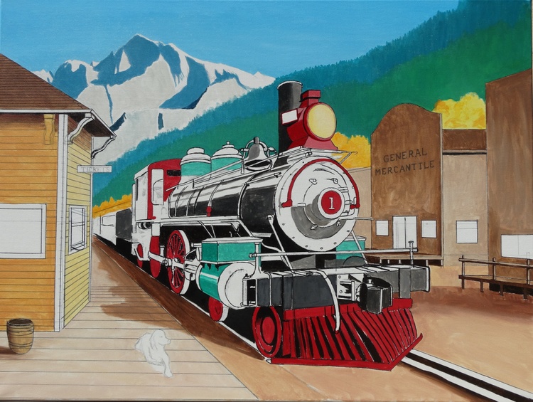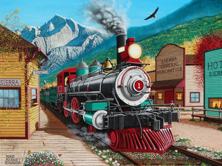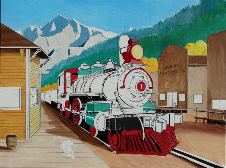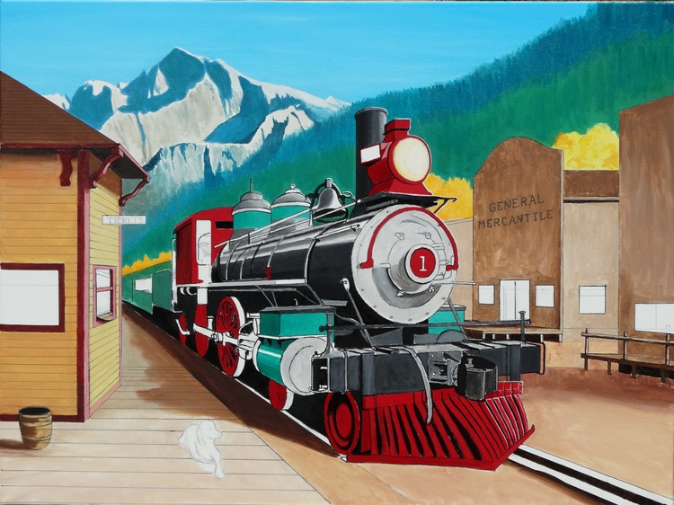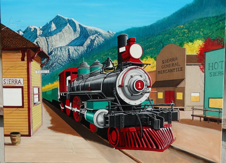 The locomotive is real, but the town is fictional You can see this real locomotive called "Stockton Terminal and Eastern No. 1" at the Travel Town Museum in Los Angeles, CA. It was built in 1864 and is in great condition.