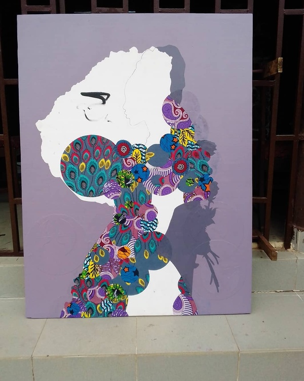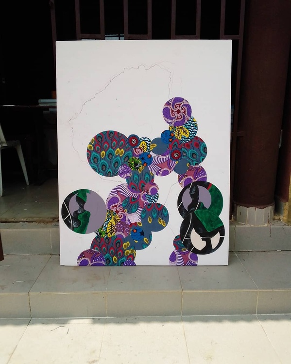 Title: Lust Lost Size: 132.0cm x 101.0cm Year: 2020 Medium: Mixed-media (Acrylic, Ankara Fabrics & Plastic bags). Context: I've seen many black men do not understand masculinity in its relationship with a woman, they therefore abuse that power and crush the woman because she's physically fragile. With this artwork, I bring to life why every (black) man must recognize his masculinity as a mean to protect the tenderness of a woman, and not become so entitled to the point getting lost in his passion for pleasure alone. The flower in the painting signifies the tenderness of a woman, which calls for careful nuturing, both verbally and physically. - Israel P.