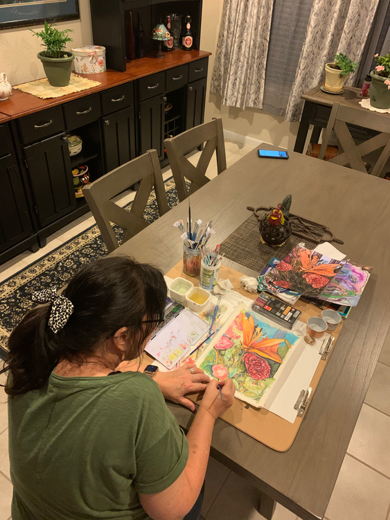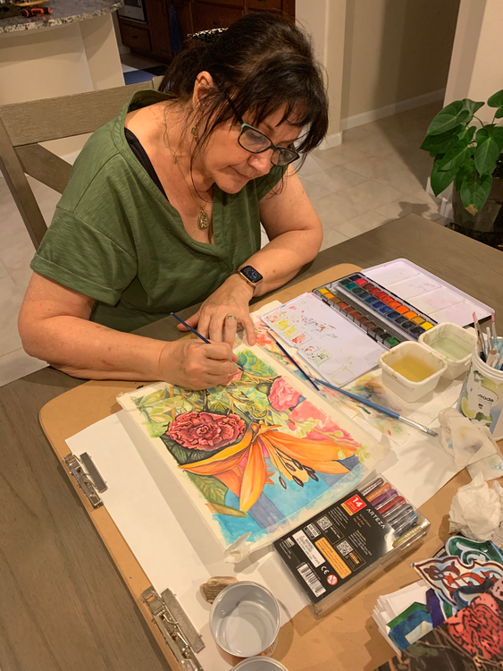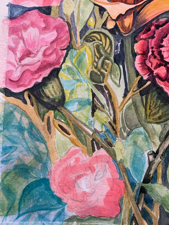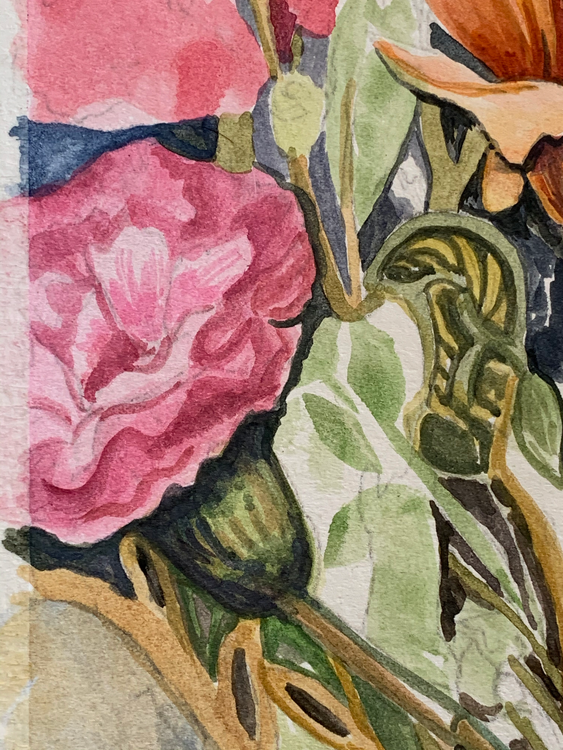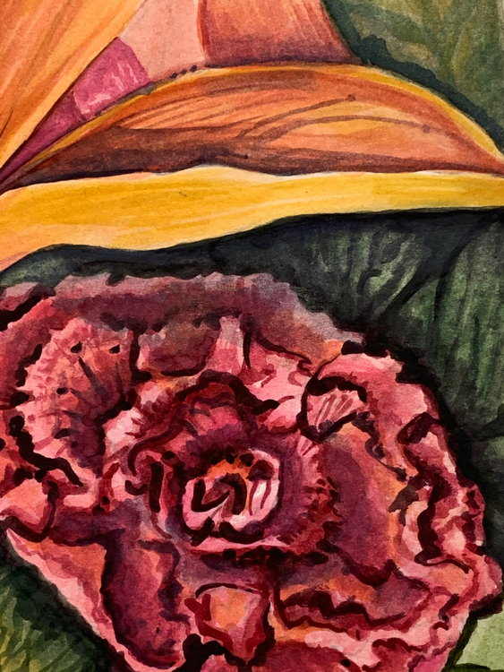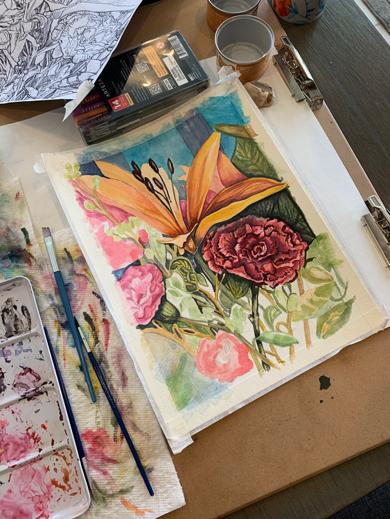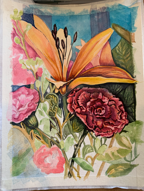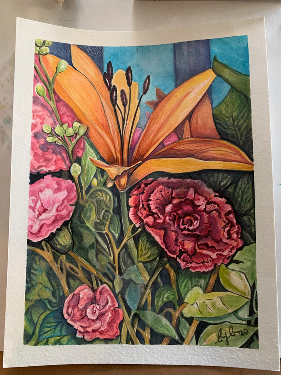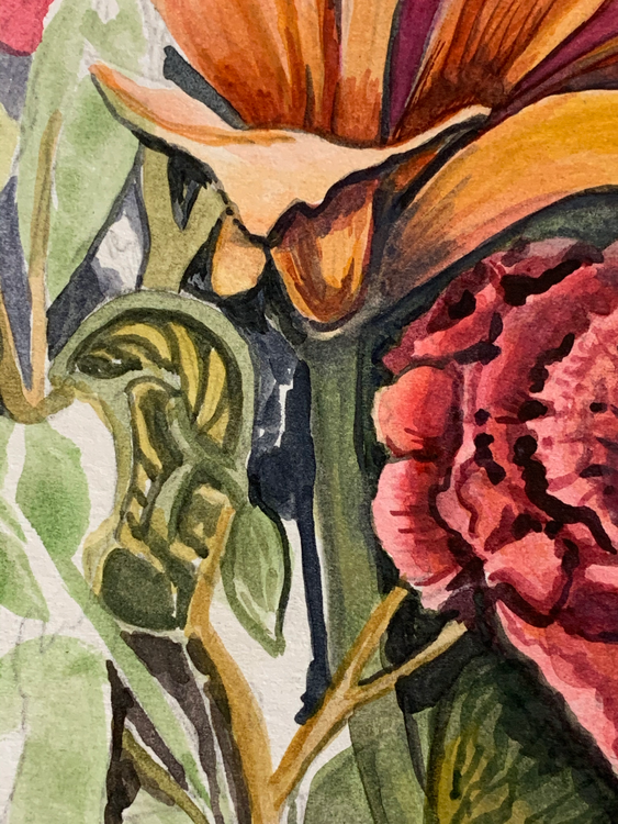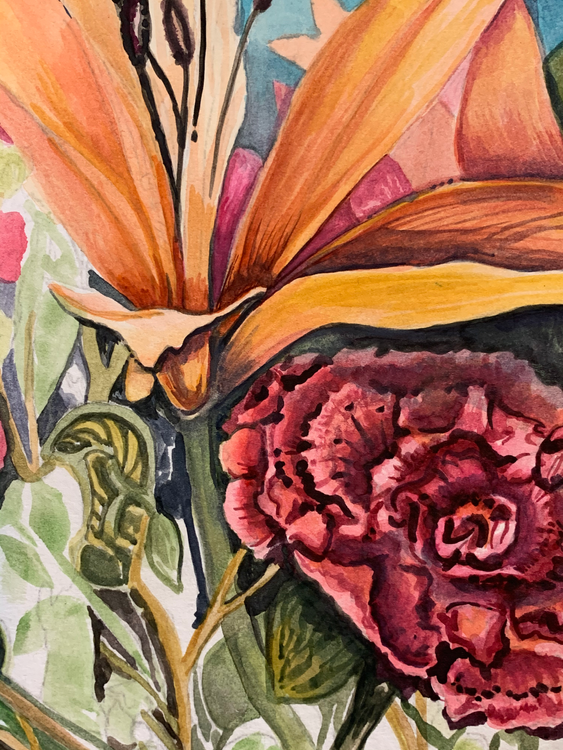 Tiger Lilly floral arrangement in watercolor. Impressionistic style, detailed, and rich in colors.