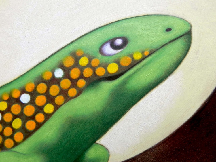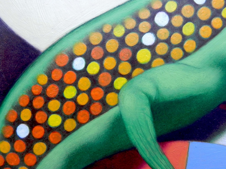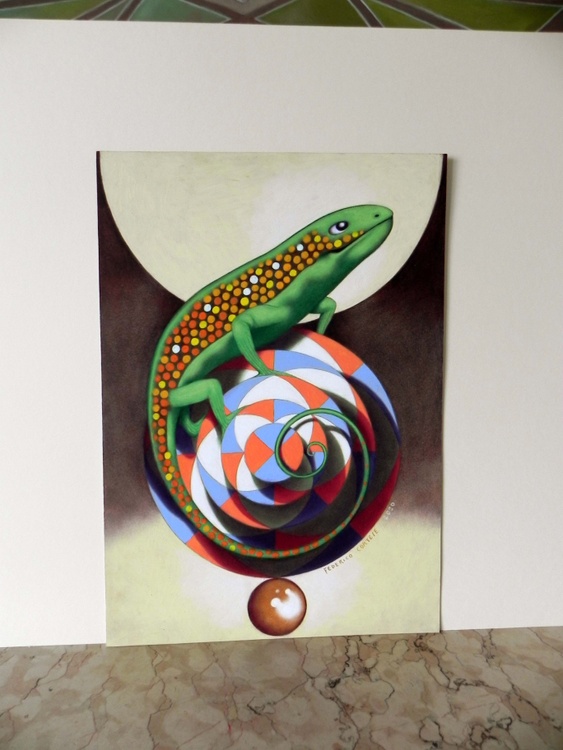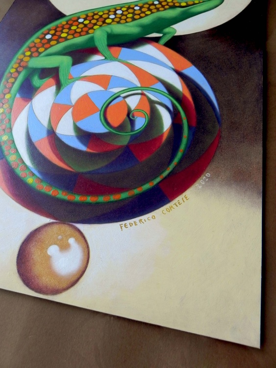 From the series “In the absence of God”, oil on thick paper, 28 x 40 cm, 2020. Original sold. The medieval illustrators represented animals that they had never seen, described by others, or derived from mythology. This generated monstrous creatures. From here comes the idea of a common set of animals, which are deformed with the help of redundant decorative codes. These artworks are made on paper overlaying subsequent layers of oil painting and pencil drawing (I often use graphite not only to emphasize the traits but as a colour itself, to fill and darken entire areas of the drawing).