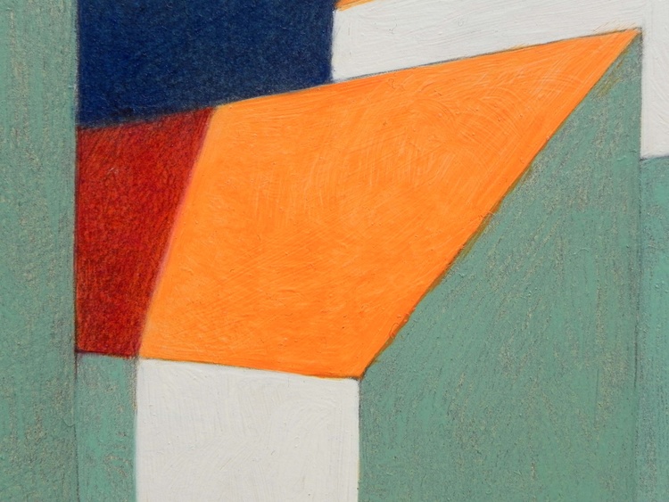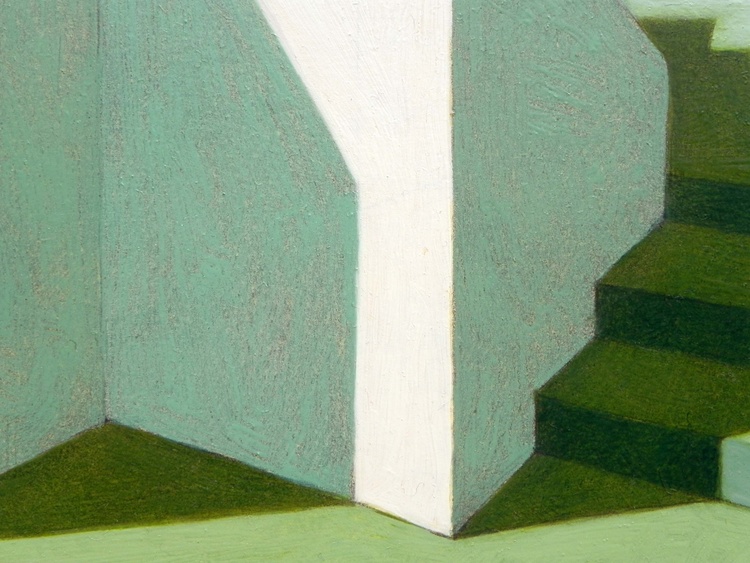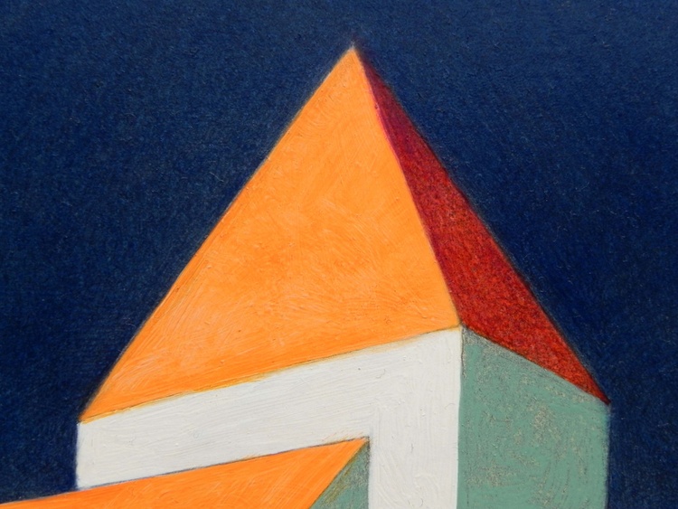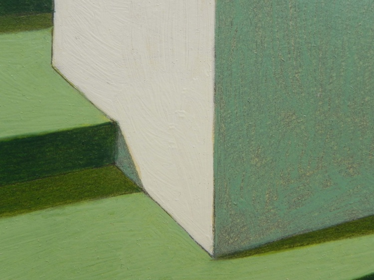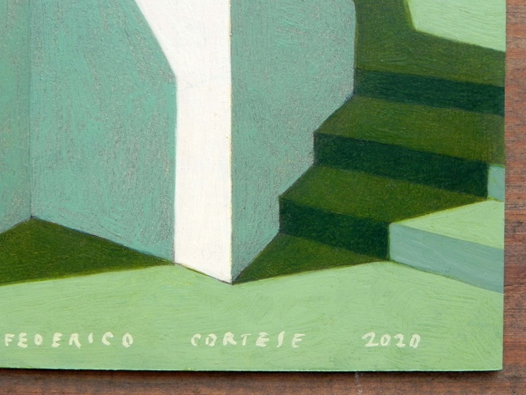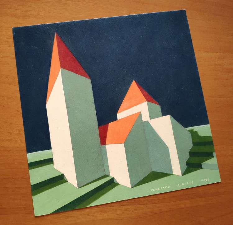 from the series “Virtual model”, oil on paper, 29 x 29 cm, 2020. Original sold. I like to create imaginary worlds. Using the modeling software I invent virtual simplified realities, probably the result of travel memories and past experiences. I choose the types of buildings, I place them on a fictitious ground, check the colors to the various parts, the lights, the elements of the landscape. And then I choose a point of view and portray this place of fantasy. The traditional landscape painting has to deal with the atmospheric variables, with the mutability of natural light. Here, on the contrary, not only everything is static, but I can change the various elements at will: add or remove pieces, move something, try the effects of shadows depending on the movement of the lights. But it is a small difference, and also the difference between "real" reality and virtual reality is now small: it has become part of our daily lives, changed our way of perceiving, and somehow has itself become real.