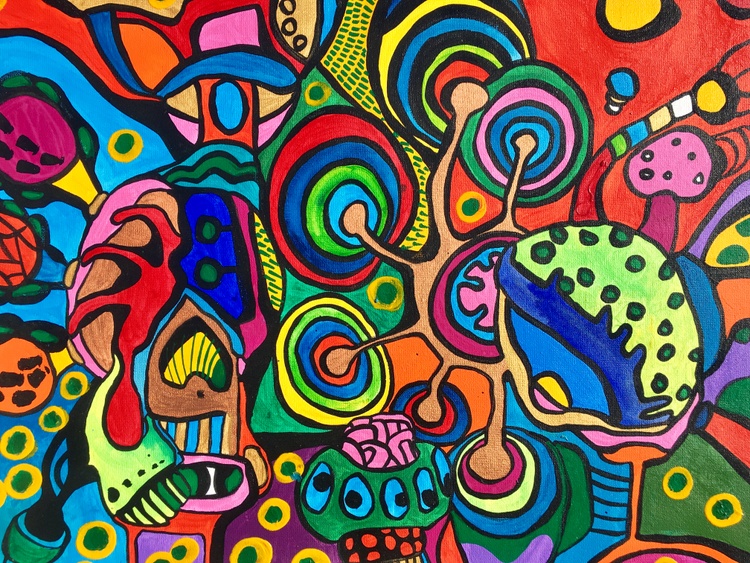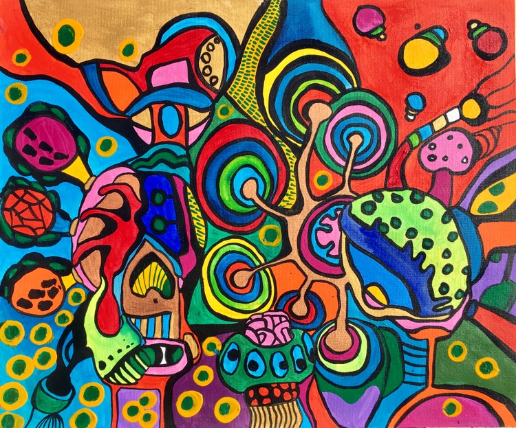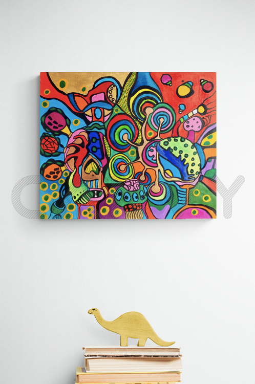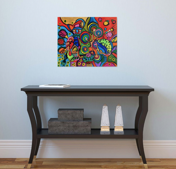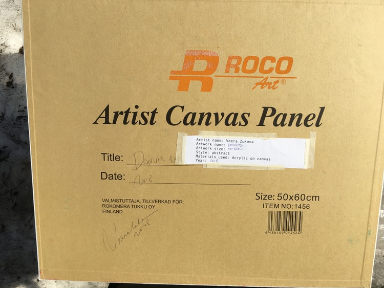 Donuts. Their shape is so interesting. I have always wondered why the donut shape is co eye-catching? What is so special about those puffy circles with a hole inside? Maybe this is some universe model to time shape. Work is totally subconscious and shapes are directly from inspiration. I can not explain what I painted, because it comes directly from my mind. I try to go to y art room as fast as possible to paint what I see. The artwork is made on a flat cardboard canvas panel. It will need a frame if you want to place it on the wall. But if you would like to put it on some kind of surface - it is ok to be without a frame. Or maybe you have an Avangard house and you want to build it into some wall.