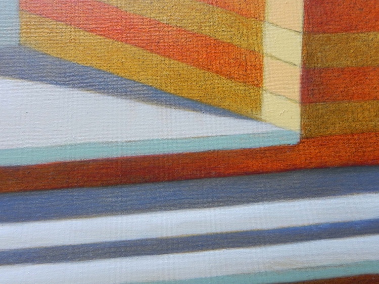 A simple and perhaps banal scene, but at the same time ambiguous and disturbing: two separate rooms, one person in each room. The viewer spies from the outside what is taking place inside. Actually he cannot know exactly what is happening. Is the boy hiding from the girl or is he catching her doing something forbidden? Or maybe nothing is happening at all, and no one of them knows anything about the other? Only the eye of the beholder generates the "drama" and can find malice in what he sees. The drama of the scene is amplified by the fact that the floor is imperceptibly inclined, from the bottom of the rooms towards the observer, as if the characters were forced to slide outwards, and by the nocturnal setting that allows the creation of shadows projected towards us. ORIGINAL SOLD.